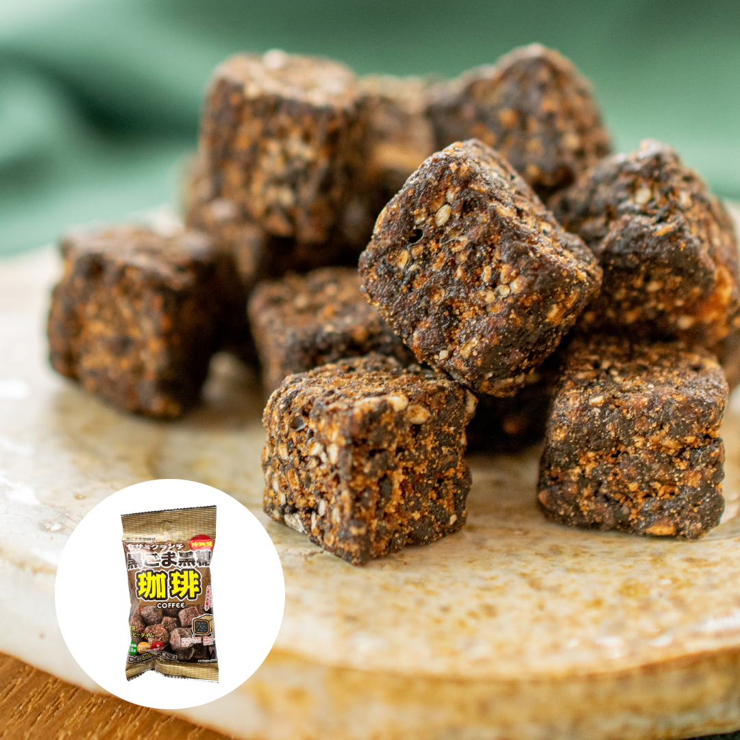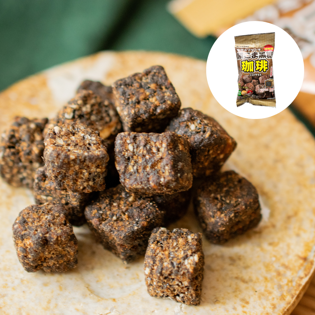 This unique sweet treat highlights one of Okinawa's regional specialties, kokuto (lit. "black sugar"). Kokuto, which is made from 100% local sugarcane juice, has a rich licorice flavor with notes of caramel and toffee. Combining the toasted, nutty flavors of the domestic black sesame seeds and almonds, as well as the aromatic bitterness of the coffee powder, this sesame snack has a well-balanced sweetness and addictive crunchy texture. Perfect for those who love the taste of a black sesame latte!