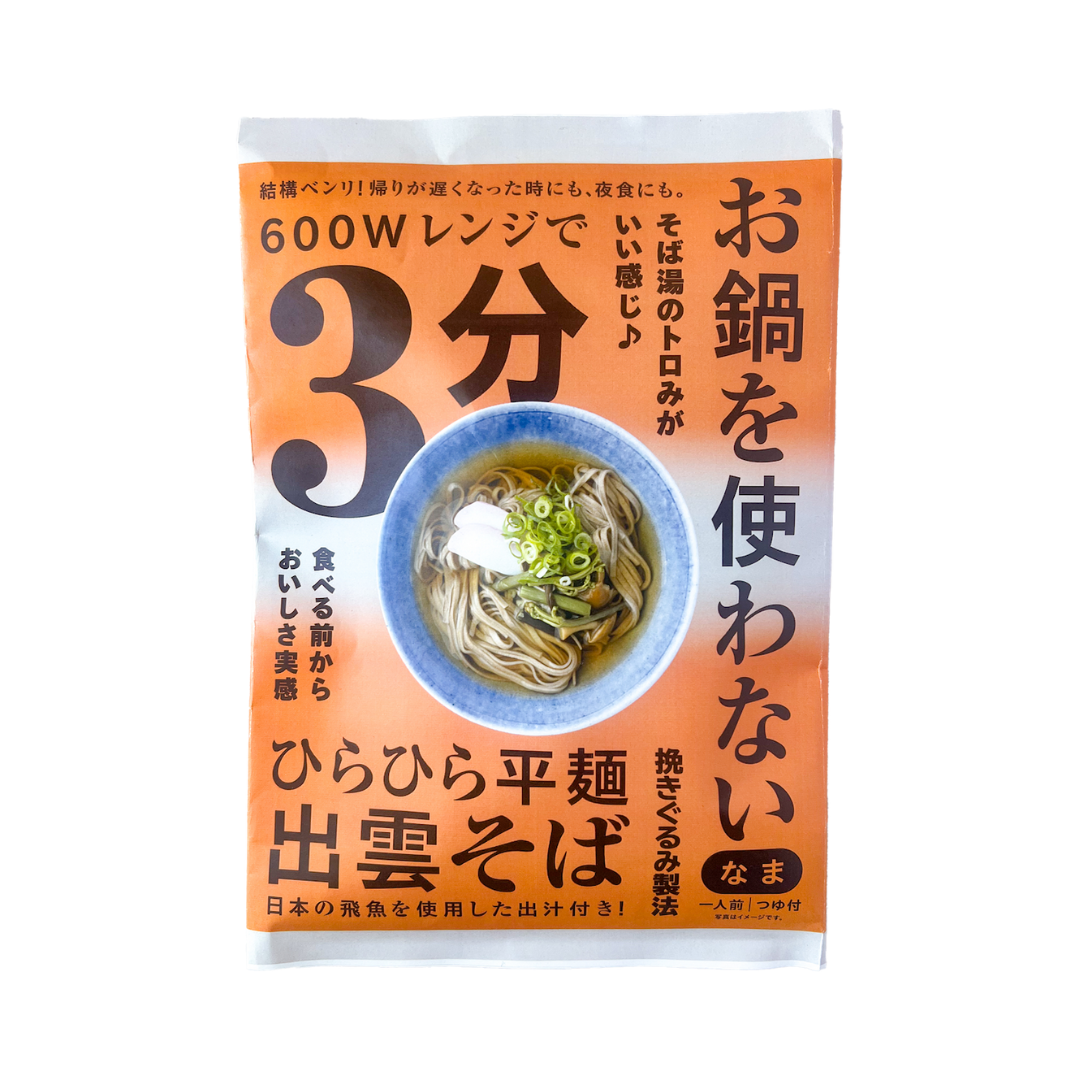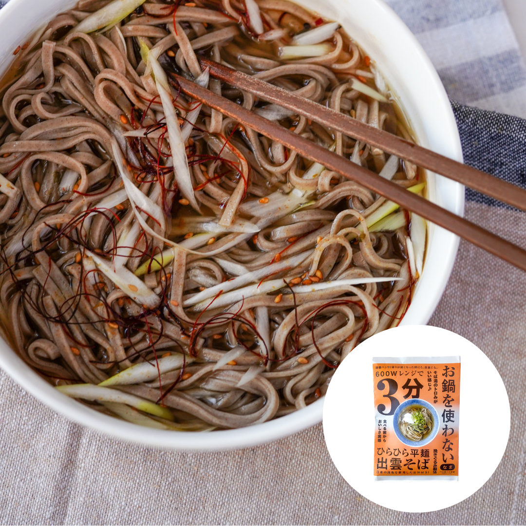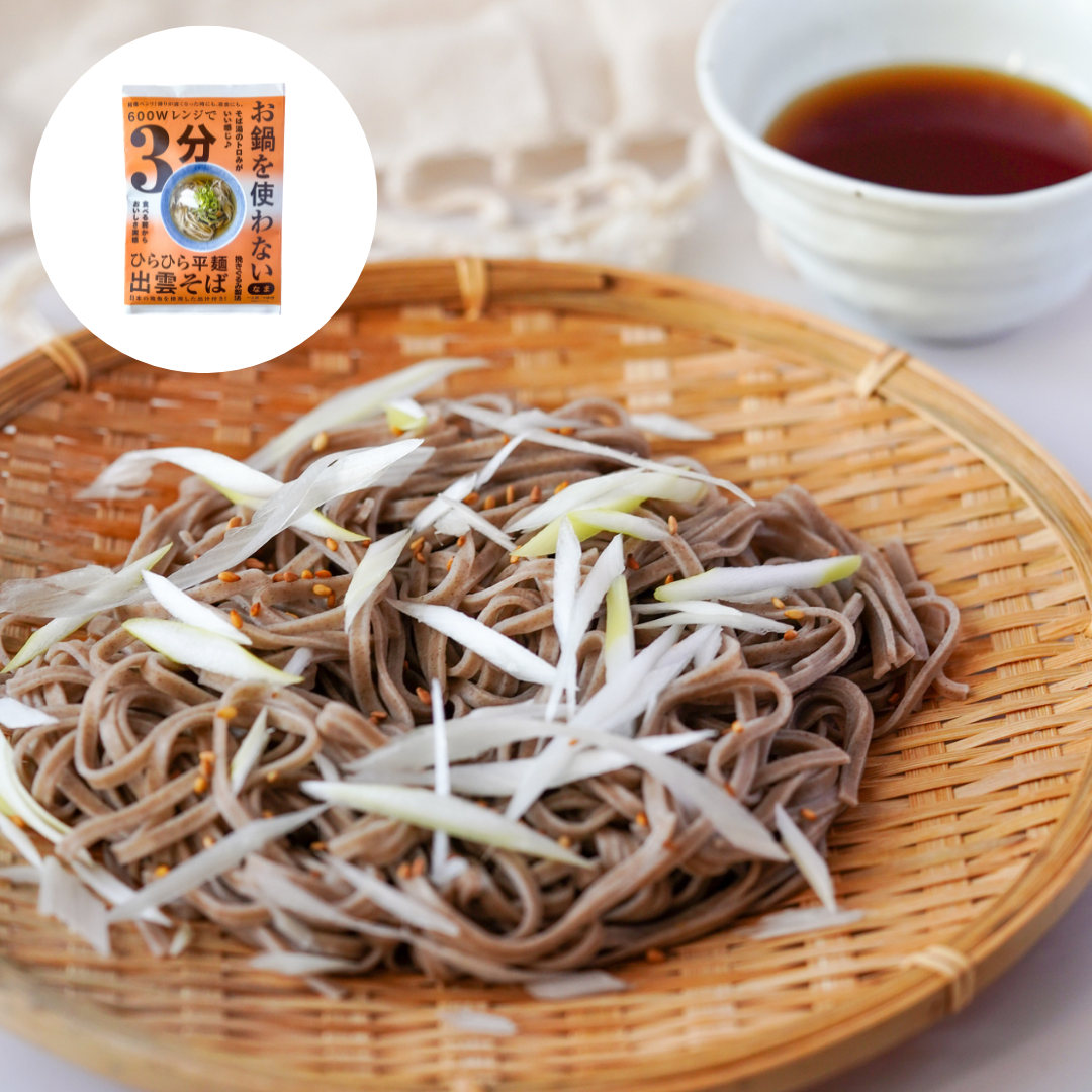 A specialty of Shimane Prefecture, Izumo soba is one of the three most famous types of soba in Japan. Featuring flat buckwheat noodles and a savory dashi broth, this dish can be enjoyed hot or cold. Honda Shoten's soba noodles are made using traditionally ground unhulled buckwheat, giving them a darker color, richer flavor, and more chewy texture. Packaged using the company's innovative steam sterilization technology, these fresh noodles are shelf-stable without the use of preservatives and ready to eat in just minutes. The included dashi broth is made with dried flying fish, bonito flakes and soy sauce, giving it a deep umami taste that is the perfect accompaniment to the robust noodles.