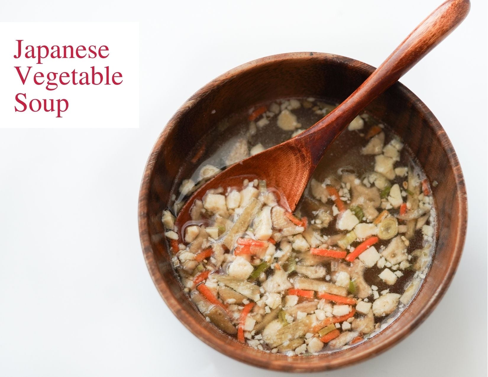 Japanese Vegetable Soup | Producer: Asuzac Foods | Prefecture: Nagano | Ingredients: Dextrin, soy sauce, starch, salt, rice miso, fermented seasoning, sesame oil, yeast extract, sugar, bonito flakes powder, bonito stock, kelp extract, spices, ingredients (tofu (domestic), burdock, boiled lotus root, green onion, dried carrots, roasted sesame), tofu coagulant, antioxidant (Vitamin E), (incl. wheat, sesame, and soybeans) Dairy-free | Size: 1 serving (7.7g)