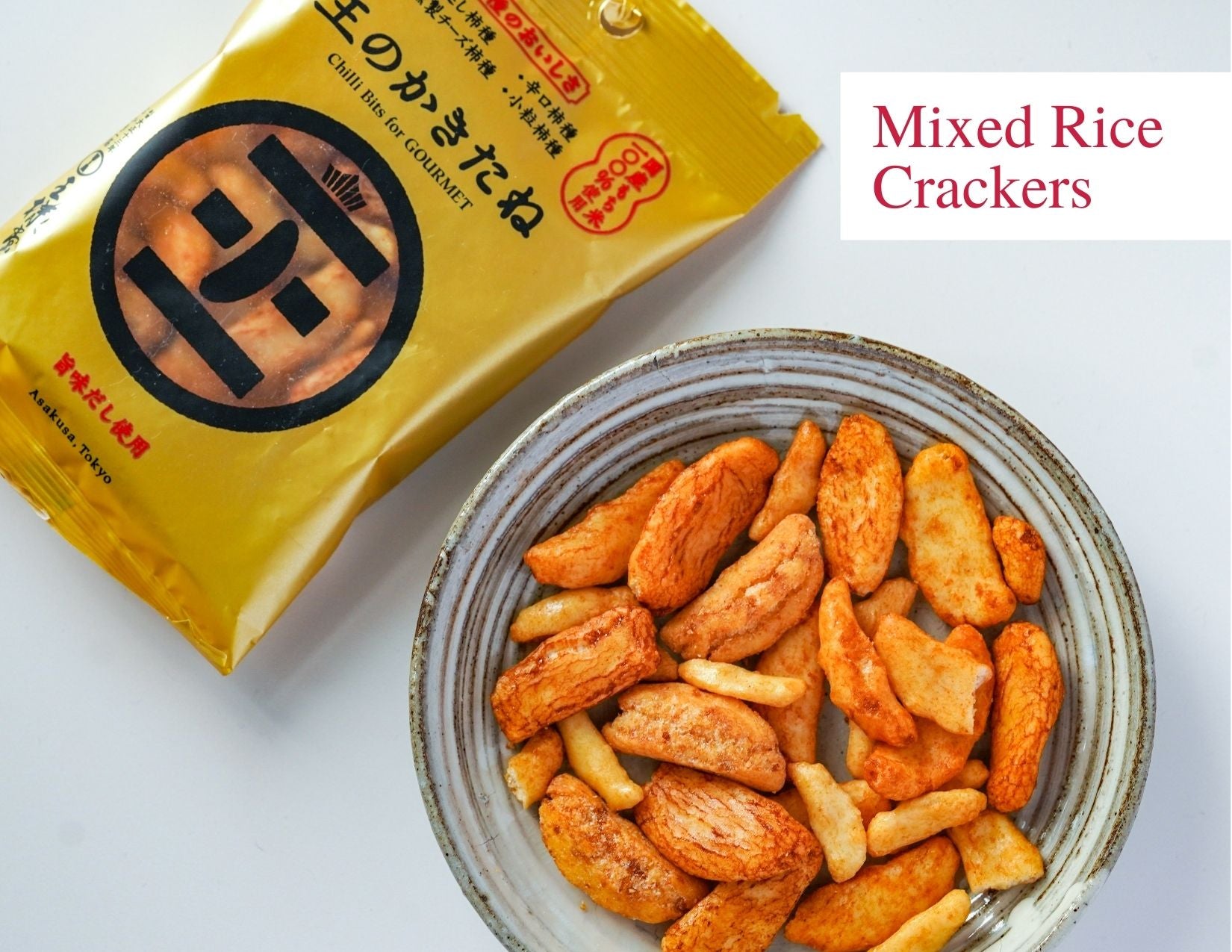 Mixed Rice Crackers | Producer: Osamado | Prefecture: Tokyo | Ingredients: Glutinous rice (domestic), soy sauce (including wheat and soybeans), vegetable oil, sugar, starch syrup, natural cheese powder (including dairy ingredients), protein hydrolyzate, fermented seasoning, chili pepper, seasoning extract (kelp extract, bonito flake extract, shiitake mushroom extract, etc.), yeast extract, salt, chili pepper seasoning liquid/ thickener (modified starch) | Size: 34g