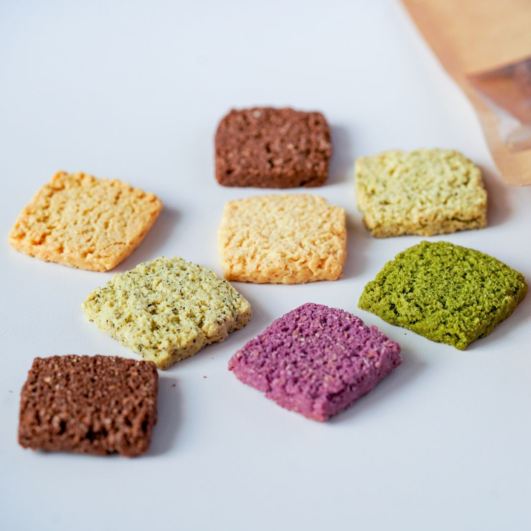 Okara Soybean Cookies | Producer: Tealife | Prefecture: Shizuoka | Ingredients: Okara (domestic), wheat flour (wheat (domestic)), almond powder, soy milk, edible rice bran oil, sugar (sugar beet (domestic)), various powders (black tea, cocoa, purple potato, spinach), salt, baking powder Vegan, Dairy-free | Size: 40g