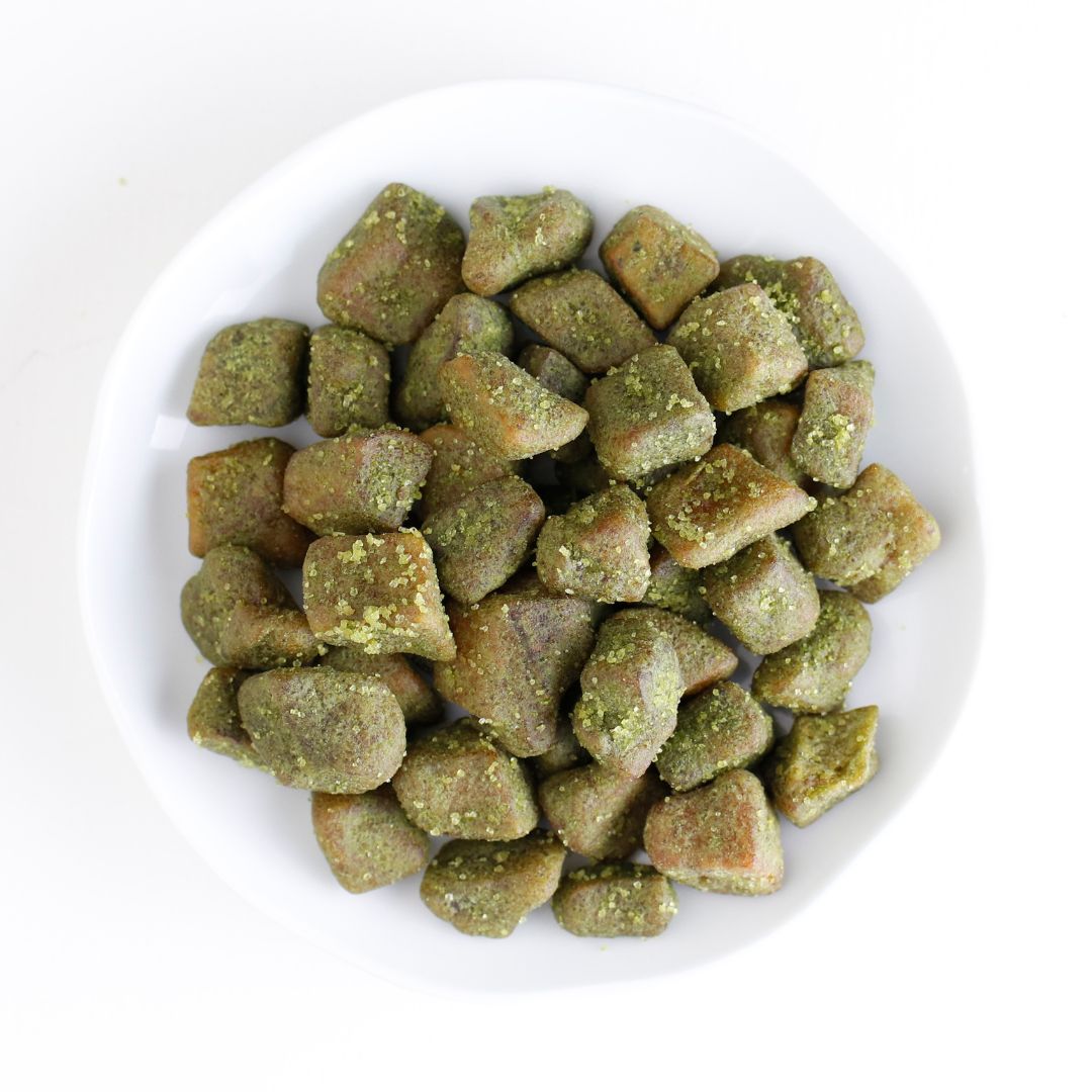 These crunchy sweet treats start with Kyushu’s famous satsuma imo sweet potato, which are cooked in a rich caramel made from 100% cane sugar, then dusted with the bittersweet, earthy notes of high-quality matcha Fukuoka.