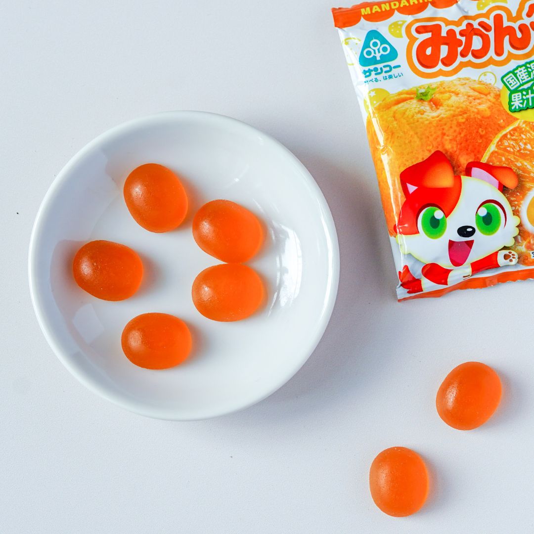 Mikan Orange Gummies | Producer: Sanko | Prefecture: Aichi | Ingredients: Starch syrup (manufactured in Japan), sugar (sugar beet (domestic)), concentrated mandarin orange juice (mandarin orange (domestic)), gelatin, powdered oblate, edible fats and oils/acidulants (citric acid), gelling agent (pectin), brightening agent Gluten-free, Dairy-free, Soy-free | Size: 20g