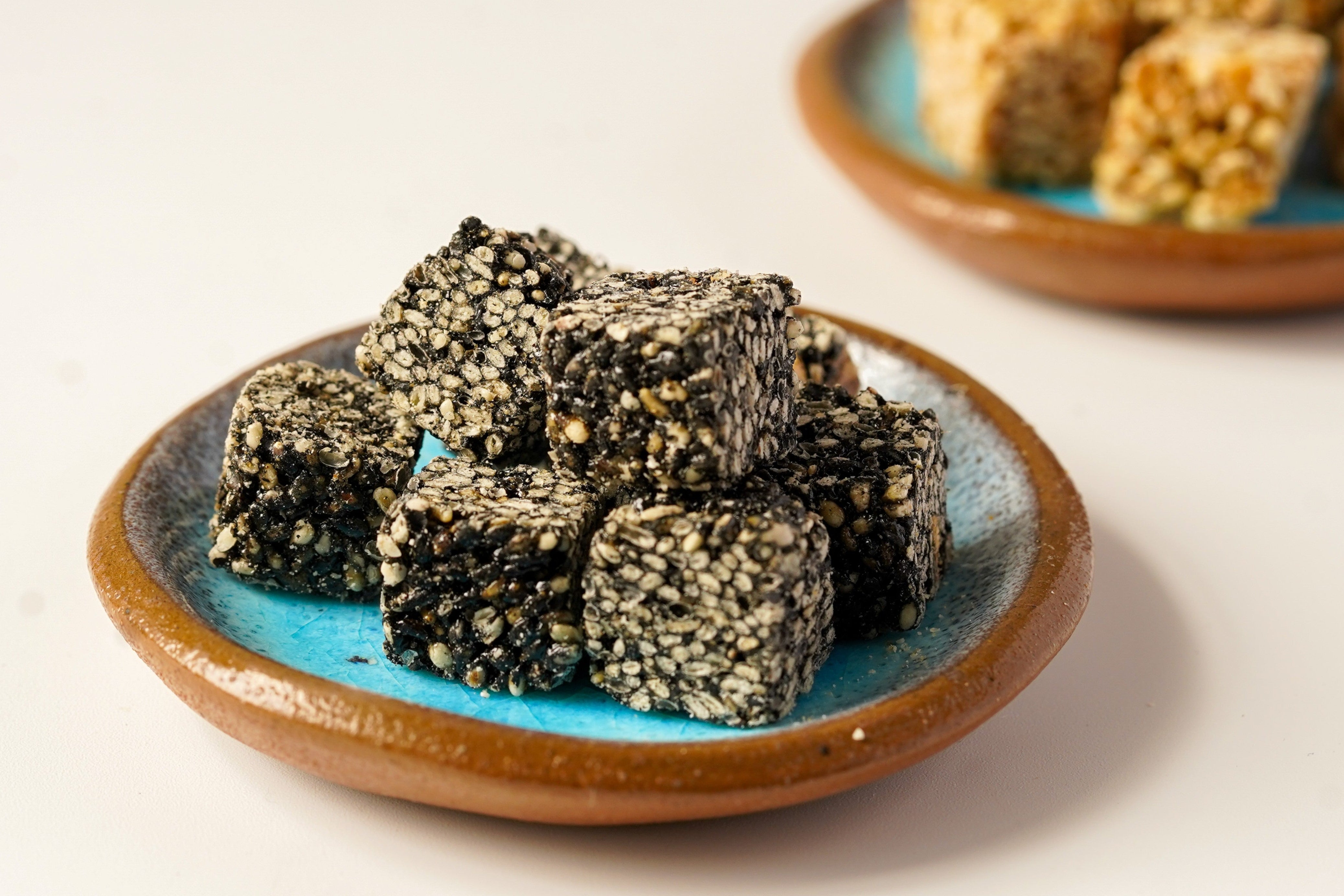 These nostalgic sesame treats reflect the culture of Okinawa, Japan's southernmost tropical islands. Salty and savory with a hint of sweetness, the bonito & soy sauce flavor combines delicate flakes of smoky bonito and umami-rich soy sauce with the nutty aroma of perfectly toasted white sesame seeds. The kokuto & kinako includes the rich licorice flavor of kokuto "black sugar" and nutty, roasted soybeans known as kinako.